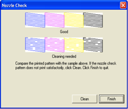 If the screen displays up to three sets of nozzles, perform up to three cleans: 99% of all blocked nozzles are caused by trapped air within the print head. If the cleaning cycle does not remove the lines, rest the printer for half an hour and perform a nozzle check. Do not continue to clean the cartridges as this will use up valuable ink from all the cartridges.